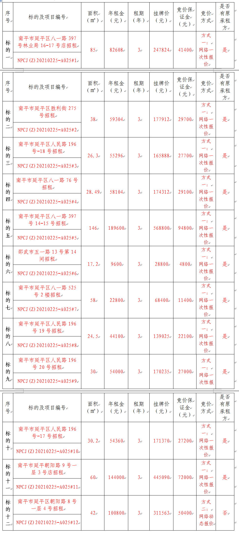 1.標的分別位于南平市延平區八一路、勝利街、人民路、朝陽路、邵武市五一路,租金按月支付。租賃標的一及標的七無遞增;租賃標的八至標的標的十的年租金自第二年起在上一年租金基礎上逐年遞增5%;租賃標的十一至標的十二自第二年起在上一年租金基礎上逐年遞增3%。 2.為便于競買人計算面積單價,網絡競價以年租金底價進行報價,最終成交價以年租金的最高報價×租賃期限。 3.本次競價標的一至標的十一屬在同等條件下原承租方享有優先承租權。 4.起租時間: 4.1若租賃標的一至標的二及標的八的原承租人未報名參加競租或報名參加競租未取得標的,原承租人應于2021年3月31日前將承租房產退還出租方,若原承租人報名參加競租并取得標的,起租時間自2021年4月1日起計算;新承租人起租時間自出租方通知接收房產之日起計算。 4.2若租賃標的三至標的六及標的九至標的十的原承租人未報名參加競租或報名參加競租未取得標的,原承租人應于2021年4月30日前將承租房產退還出租方,若原承租人報名參加競租并取得標的,起租時間自2021年5月1日起計算;新承租人起租時間自出租方通知接收房產之日起計算。 4.3若租賃標的七及標的十一的原承租人未報名參加競租或報名參加競租未取得標的,原承租人應于競租會次日起7天內將承租房產退還出租方,若原承租人報名參加競租并取得標的,起租時間自成交公示期滿次日起計算;新承租人起租時間自出租方通知接收房產之日起計算。 4.4租賃標的十二新承租人起租時間自成交公示期滿次日起計算。 5.因本次租賃標的一至標的十一的原承租方未予騰退,若本租賃房屋由原承租方外的第三人競得,自成交確認起3個月內出租方仍無法收回租賃房屋的,出租方與新承租方均有權解除合同,合同解除后,出租方無息退還新承租方合同履約保證金,出租方、組織方不再承擔其它法律責任。 6.具體事項以與出租方簽訂《房屋租賃合同》為準。 |