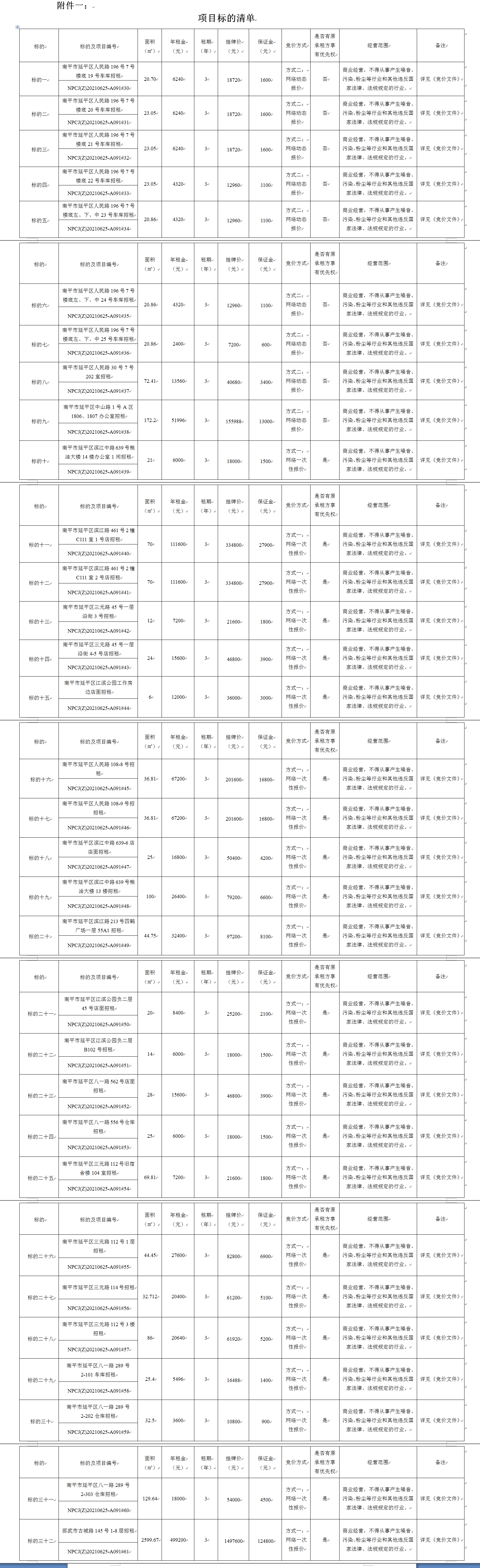 1.租賃用途:詳見附件一。 2.于競買人計算面積單價,網(wǎng)絡(luò)競價以年租金底價進行報價,最終成交總額以年租金的最高報價×租賃期限。 3.本次競價標的十至標的三十二屬在同等條件下原承租方享有優(yōu)先承租權(quán)。 4.裝修情況:以實際現(xiàn)場看樣為準。 5.原租賃合同到期日: 5.1租賃標的標的十至標的十五、標的二十五至標的二十七及標的二十九至三十原租賃合同于2021年5月31日到期; 5.2租賃標的十六至標的二十四及標的三十二原租賃合同于2021年6月30日到期; 5.3租賃標的三十一原租賃合同于2021年6月19日到期; 5.4租賃標的二十八原租賃合同于2021年4月30日到期。 6.起租時間:若原承租人未報名參加競租或報名參加競租未取得標的,原承租人應(yīng)于原租賃合同到期次日起7天內(nèi)將承租房產(chǎn)退還出租方,若原承租人報名參加競租取得標的的,起租時間自成交公示期滿次日起計算(若原合同期限未到期的新合同自然延順);新承租人起租時間自出租方通知接收房產(chǎn)之日起計算。 7.具體事項以與出租方簽訂《房屋租賃合同》為準。提示:以上標的概況由出租方提供披露,具體項目標的狀況以現(xiàn)場看樣和相關(guān)文件的數(shù)據(jù)為準。 |